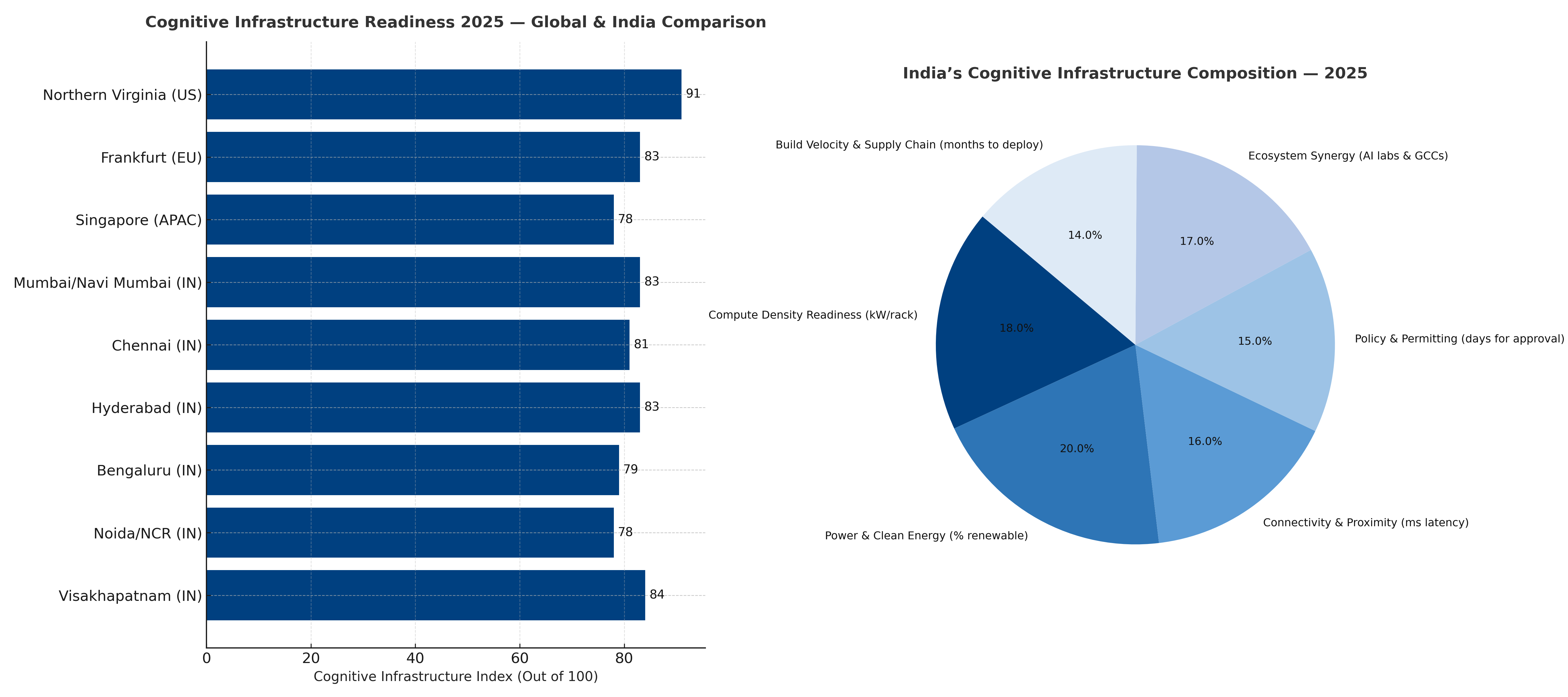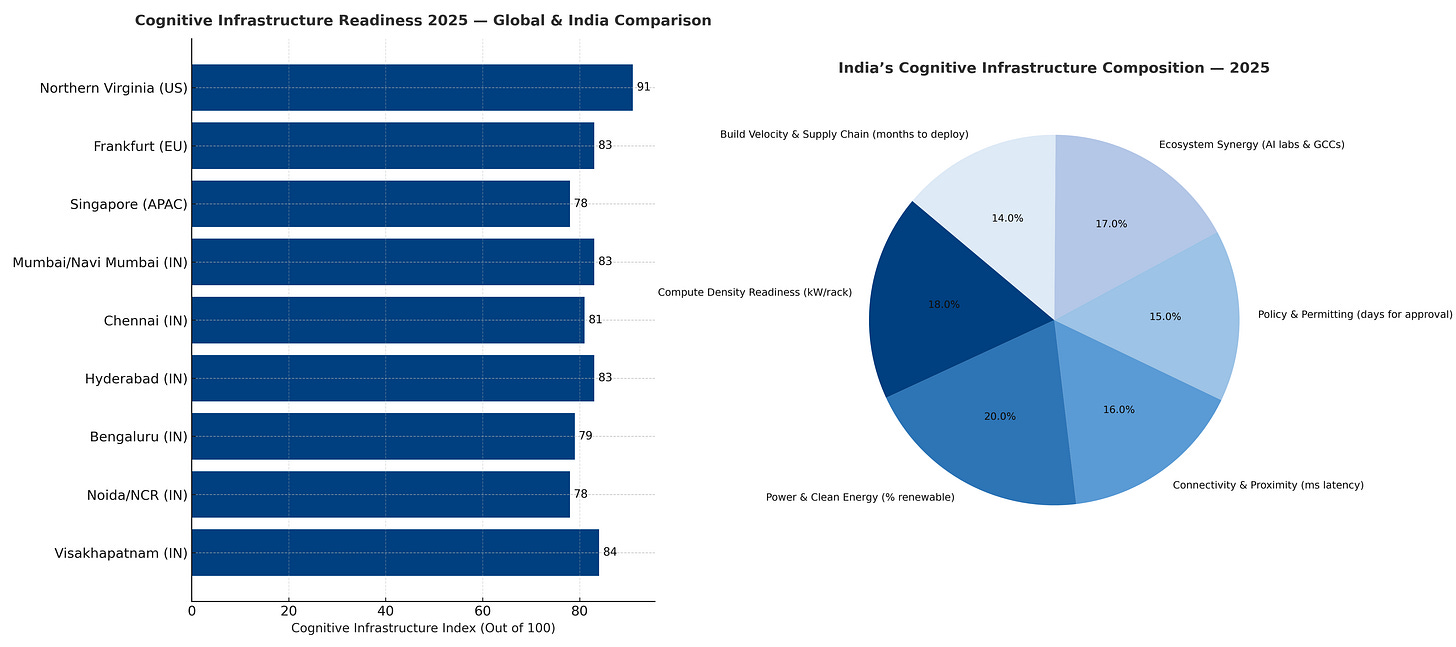 If GDP measures production and ESG measures conscience, the Cognitive Index measures awareness—the ability of a society to expand intelligence without exhausting the planet. In 2025, India’s cognitive-infrastructure ecosystem scores 83 out of 100, a profile described as Cognitively Mature, Sustainably Conscious. Its strength lies in policy clarity, renewable integration, and ecosystem depth; its vulnerabilities are rooted in power stability and water use. The country once known for exporting code now exports capacity to think, architected through energy, geography, and governance.