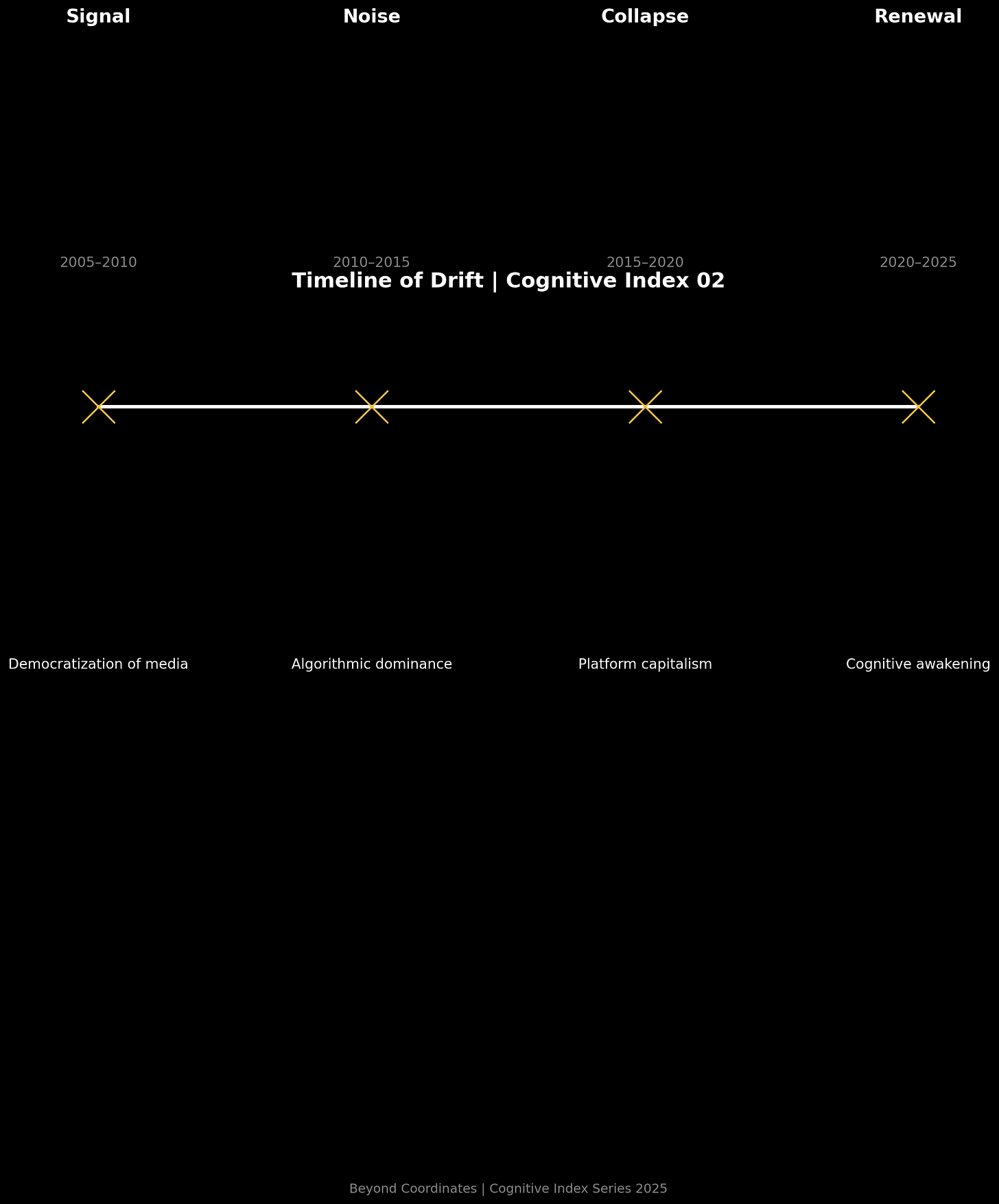 Timeline of Drift (2005–2025): From Signal to Renewal — charting the rise, saturation, and recalibration of global content systems.