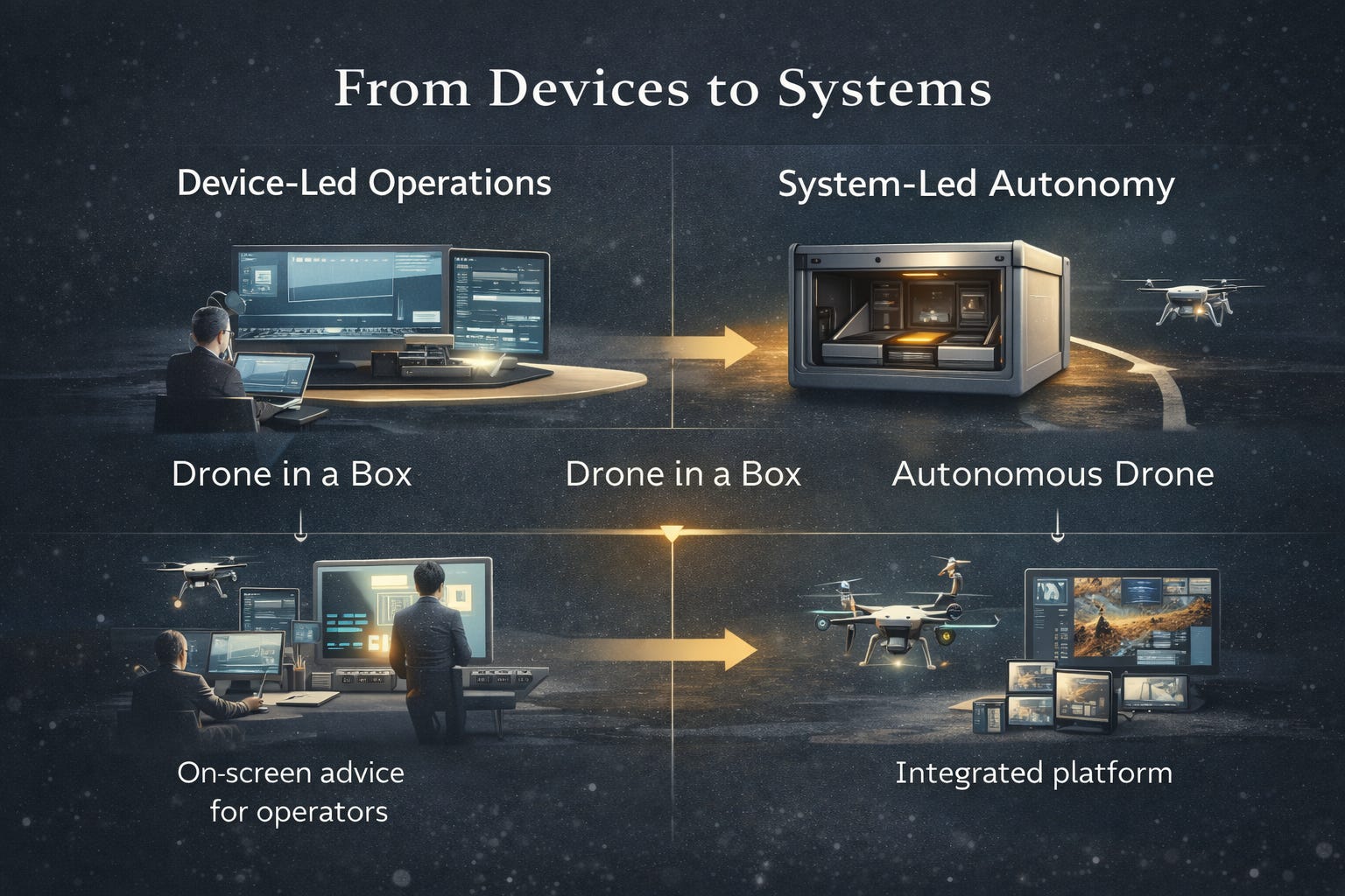 One of the clearest examples of this shift is the Drone in a Box model. By Drone in a Box, I mean a fixed on site docking system where a drone can automatically launch, execute a mission, recharge, and redeploy without a human pilot present.