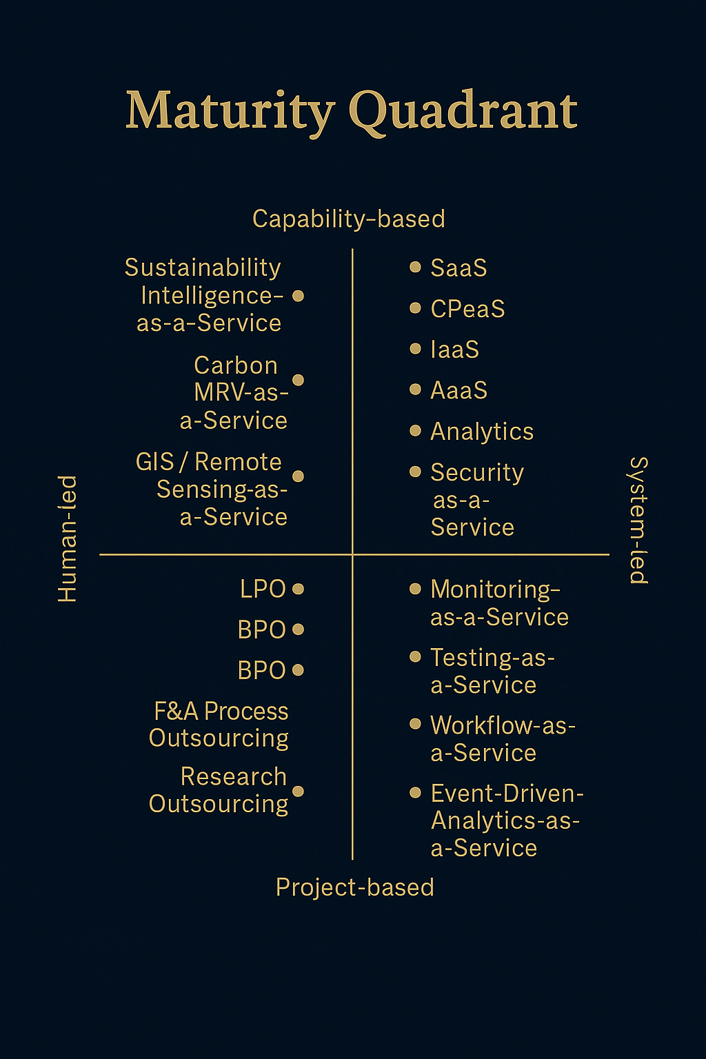 Maturity Quadrant mapping key as-a-Service models by leadership style (human-led vs system-led) and orientation (project-based vs capability-based).